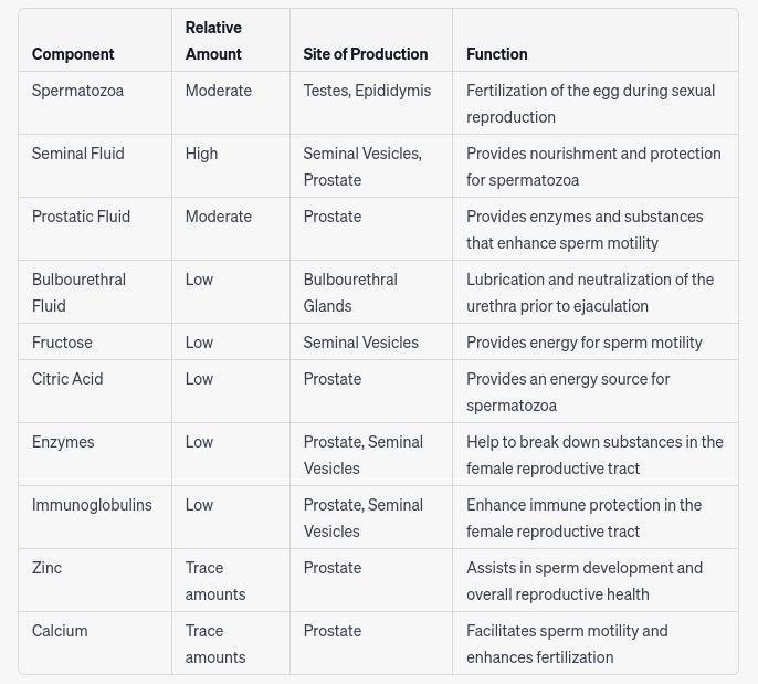 Here is a table listing some of the components found in semen, along with their relative amounts, site of production, and function:\