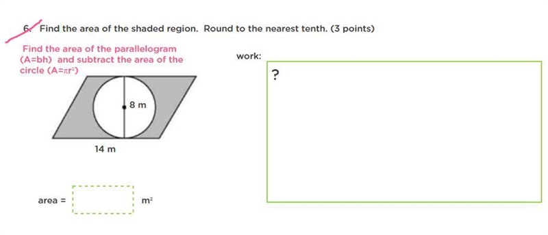 Given our area formulas, we know we have our b and h in our parallelogram formula given. If our circle diameter is 8m, our circle radius must be 4m. Therefore, we have every element of our formulas we need.