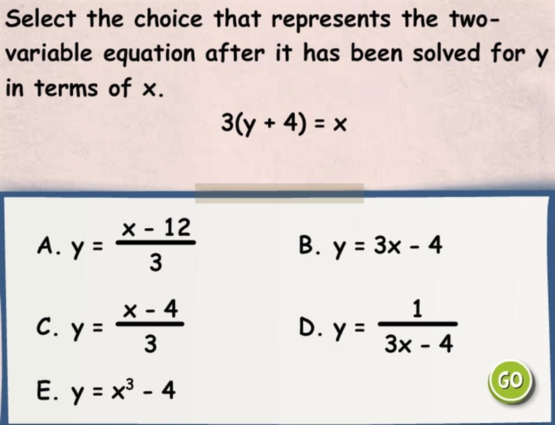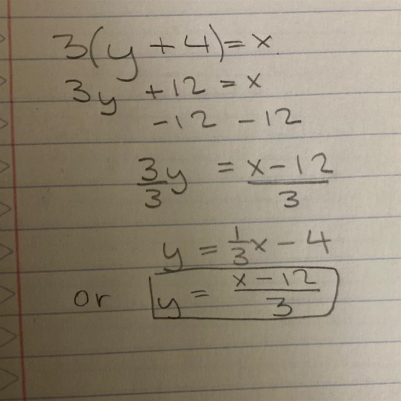 the answer is y= x-12/3 ( “x-12/3 is -12 over 3)