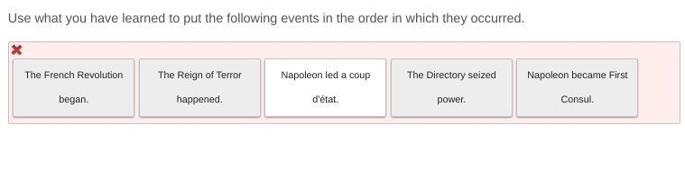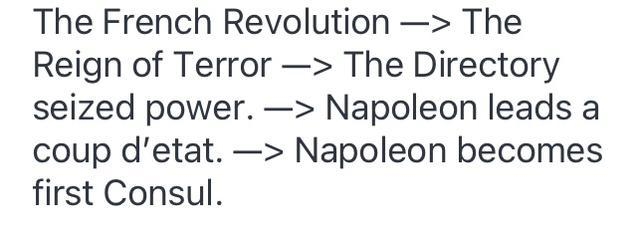 The French Revolution —> The Reign of Terror —> The Directory seized power. —> Napoleon leads a coup d’etat. —> Napoleon becomes first Consul.