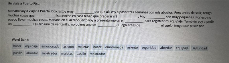 Mañana voy a viajar a Puerto Rico. Estoy muy emocionado porque allí voy a pasar semanas con mis abuelos. Pero antes de salir, tengo muchas cosas que hacer esta noche en casa. Tengo que preparar mi maleta. Mis maletas son muy pequeñas, por eso no puedo llevar muchas cosas mañana en el aeropuerto. Voy a presentarme en el mostrador de facturación para registrar mi equipaje. También voy a pedir un boleto de avión. Quiero uno de ventanilla, no quiero uno de pasillo. Luego, antes de abordar el vuelo, tengo que pasar por el control de seguridad.