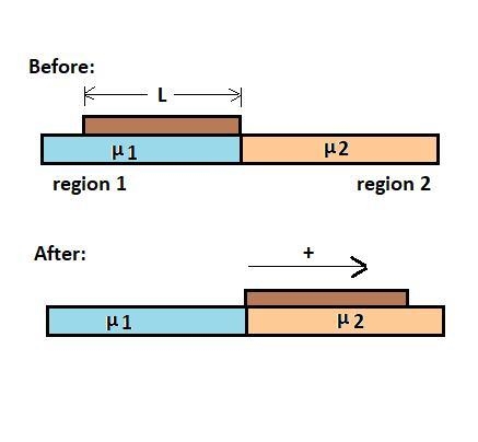A uniform board of length L and mass M, lies near a boundary that separates two regions. In region 1, the coefficient of kinetic friction between the board and the surface is , and in region 2, the coefficient is