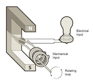 Answer: When the wire moves in a magnetic field, electrons in the wire move and become an electric current. The current causes the light to glow. Mechanical energy used to rotate the loop is converted to electrical energy.