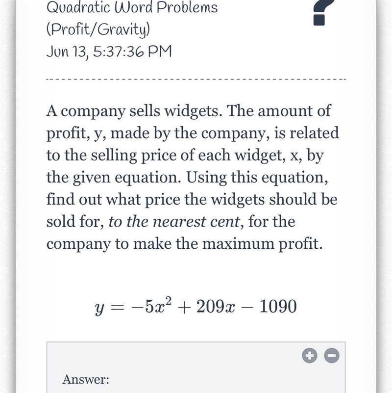 So for this equation, like any quadratic with a negative leading coefficient, the maximum will occur at its vertex, with x-price at y-profit.