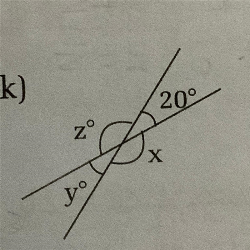 In this question, the vertically opposite angle pairs are x, z° and y, 20°.