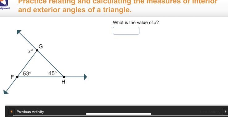 You want the measure of exterior angle x°, given that remote interior angles are 53° and 45°.