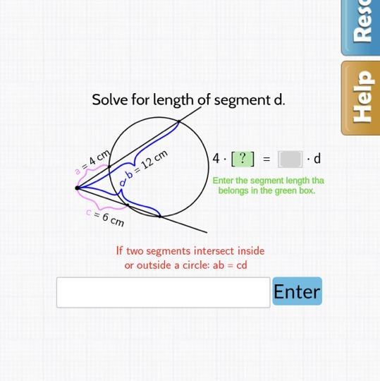 We are given a circle, with two segments that intersect the circle. We also know that a = 4 cm, b = 12 cm, c = 6 cm.