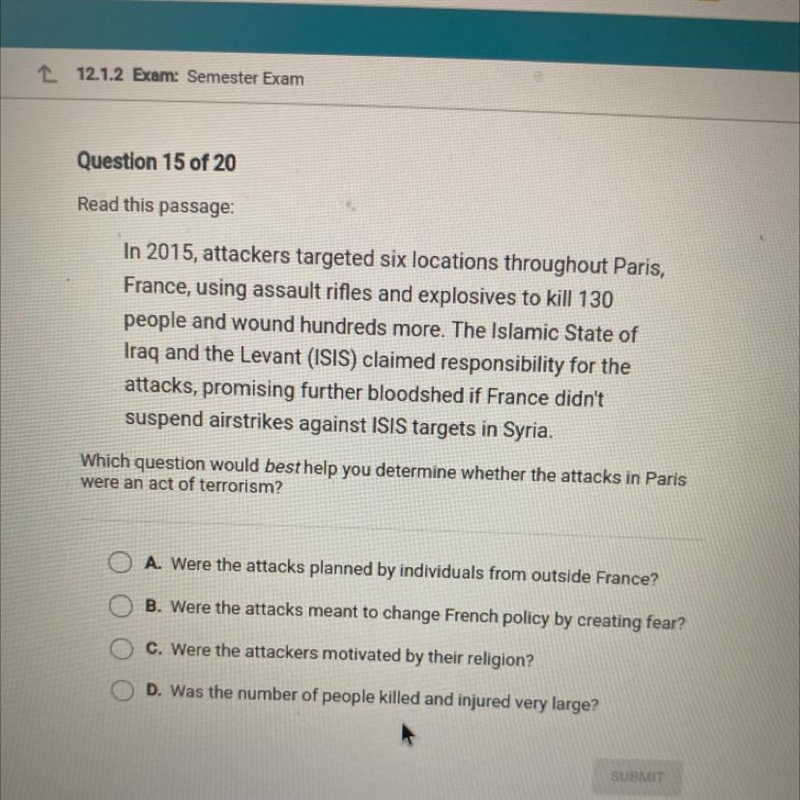 The question that would best help determine whether the attacks in Paris were an act of terrorism is "Were the attacks meant to change French policy by creating fear?" (Option B). This is because terrorism refers to the use of violence or intimidation in pursuit of political aims, and the attacks in Paris were carried out by individuals claiming to represent ISIS and were intended to force France to change its foreign policy. The other questions may provide additional context or information, but Option B is the most relevant in defining the attacks as an act of terrorism.