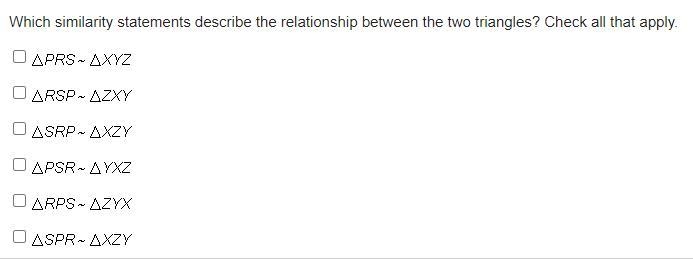Which similarity statements describe the relationship between the two triangles? Check all that apply.