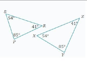 Triangle S R P. Angle S is 54 degrees, R is 41 degrees, P is 85 degrees. Triangle X Y Z. Angle X is 54 degrees, Z is 41 degrees, and Y is 85 degrees.