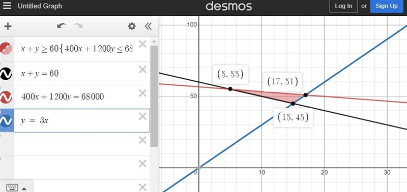 We'll then shade above the line y = -x+60 because of the "greater than" symbol associated with this corresponding inequality. The same goes for y = 3x. The other inequality has "less than" to mean we shade below that boundary.