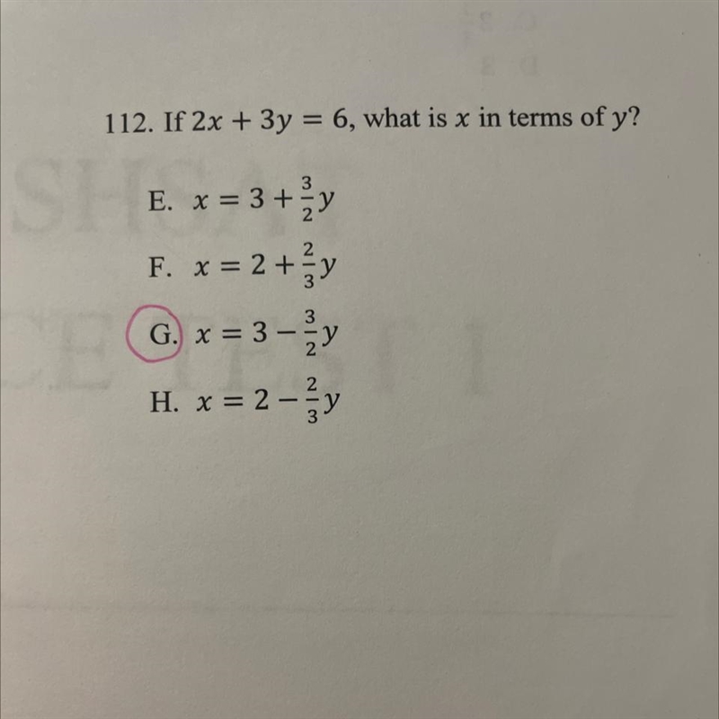 If 2x + 3y = 6, what is x in terms of y? Please explain why it’s G.