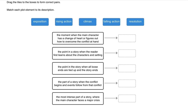 Drag the tiles to the boxes to form correct pairs. Match each plot element to its description
