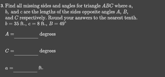 a = 35sin(121.1°)/sin(49°) = 39.7 feet