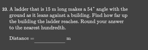 A ladder that is 15m long makes a 54 degree angle with the ground as it leans against a building.