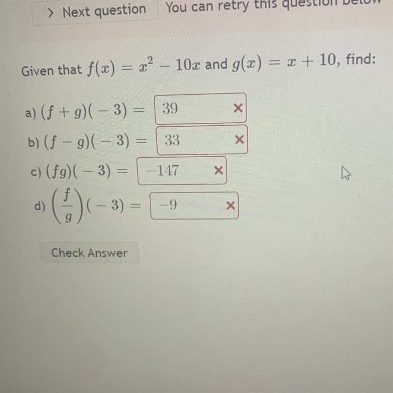 c) (fg)(-3) = ((-3)² - 10(-3))(-3 + 10)