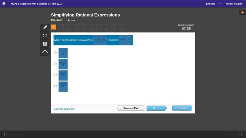 Which expression is equivalent to StartFraction negative 18 a Superscript negative 2 Baseline b Superscript 5 Baseline Over Negative 12 a Superscript negative 4 Baseline b Superscript negative 6 Baseline EndFraction? Assume a not-equals 0, b not-equals 0.