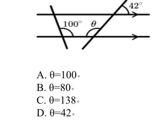 Calculate the size of angle 0 A= 100 B=80 C=138 D= 42 Show your workings out.