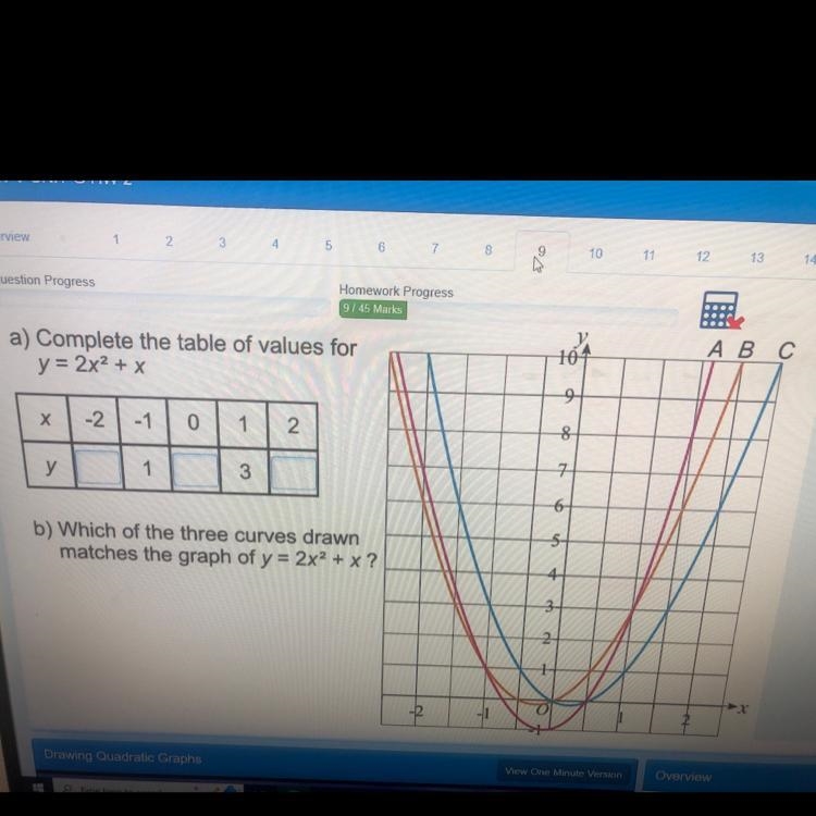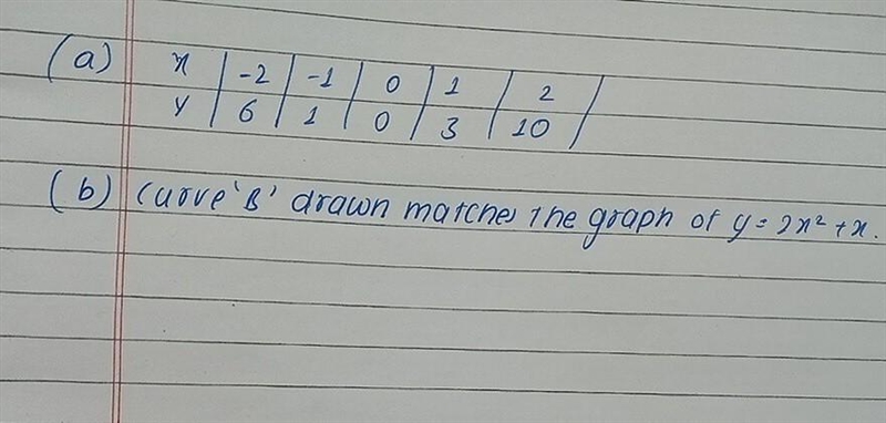 A) Complete the table of values for y = 2x² + x X y -2 -1 1 0 1 3 2 b) Which of the three curves drawn matches the graph of y = 2x² + x ?