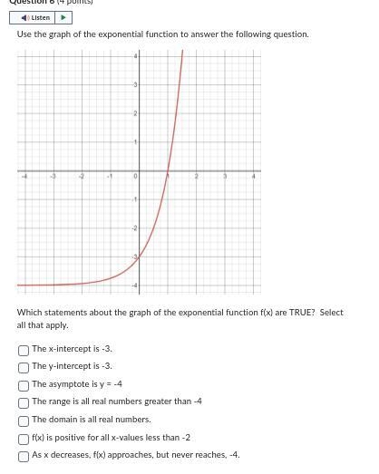 y intercept = -3 asymptote = -4 domain = all real numbers range = all real numb grwaeater than 4 as x decreases, f(x) approcached s 4