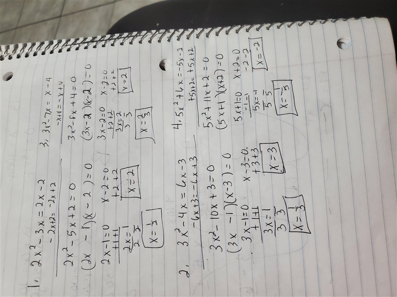 3. 3x^2 − 7x = x − 4 4. 5x^2 + 6x = −5x − 2