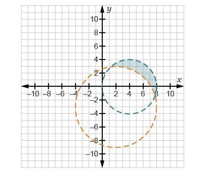 This is because the shaded area is inside the first circle (centered at (4, 0) with a radius of 4) but outside the second circle (centered at (2, -3) with a radius of 6). The inequalities reflect these conditions by setting the inequality signs accordingly. The inequality with "<" for the first circle ensures that the shaded area is within the circle, and the inequality with ">" for the second circle ensures that the shaded area is outside the circle.