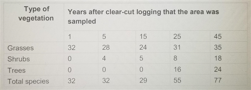 The pattern of changes suggests that after the initial disturbance of logging, grasses were the first vegetation to recover and colonize the open area. Then over time, shrubs and trees established and the plant community transitioned from grasses to shrubs to trees. This successional progression from early to later species resulted in an overall increase in species diversity as different types of plants colonized the area.