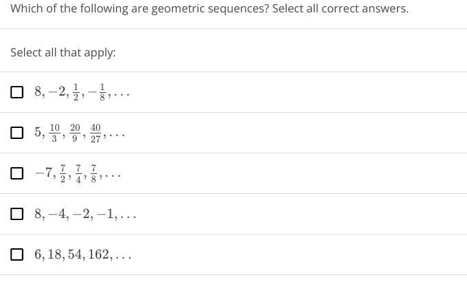 Which of the following are geometric sequences? Select all correct answers.-example-1