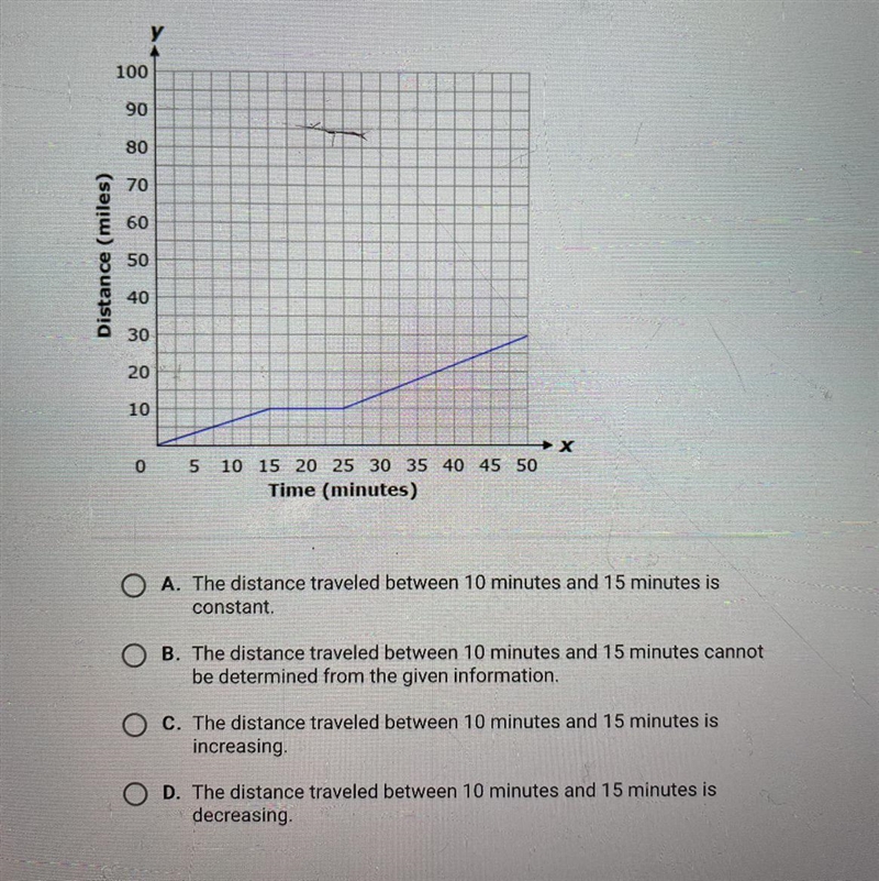 Step-by-step explanation: The answer would be that the distance traveled between 10 minutes and 15 minutes is increasing (C). Because the graph shows that the distance is increasing. A would-be eliminated because it isn't constant as he is not on break yet. D is eliminated as you can't decrease the distance traveled. B is eliminated because the graph is enough info.