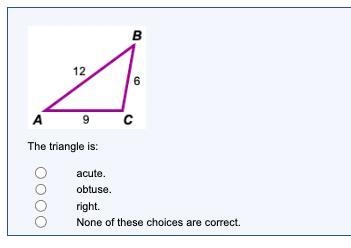 The triangle is: acute. obtuse. right. None of these choices are correct.