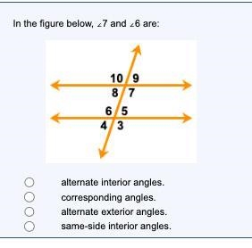 In the figure below, ∠7 and ∠6 are: alternate interior angles. corresponding angles. alternate exterior angles. same-side interior angles.