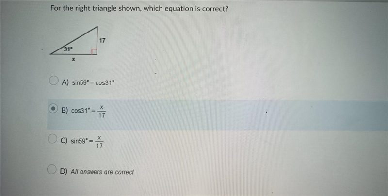 The legs of the given right triangle are labelled "x" and "17". The hypotenuse is not labelled. Therefore, as both the sine and cosine ratios include the hypotenuse, sin 59° and cos 31° cannot equal x/17.
