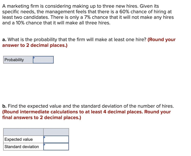 b. Find the expected value and the standard deviation of the number of hires. (Round intermediate calculations to at least 4 decimal places. Round your final answers to 2 decimal places.)