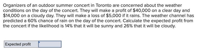expected profit = (probability of sunny day * profit on sunny day) + (probability of cloudy day * profit on cloudy day) + (probability of rainy day * loss on rainy)