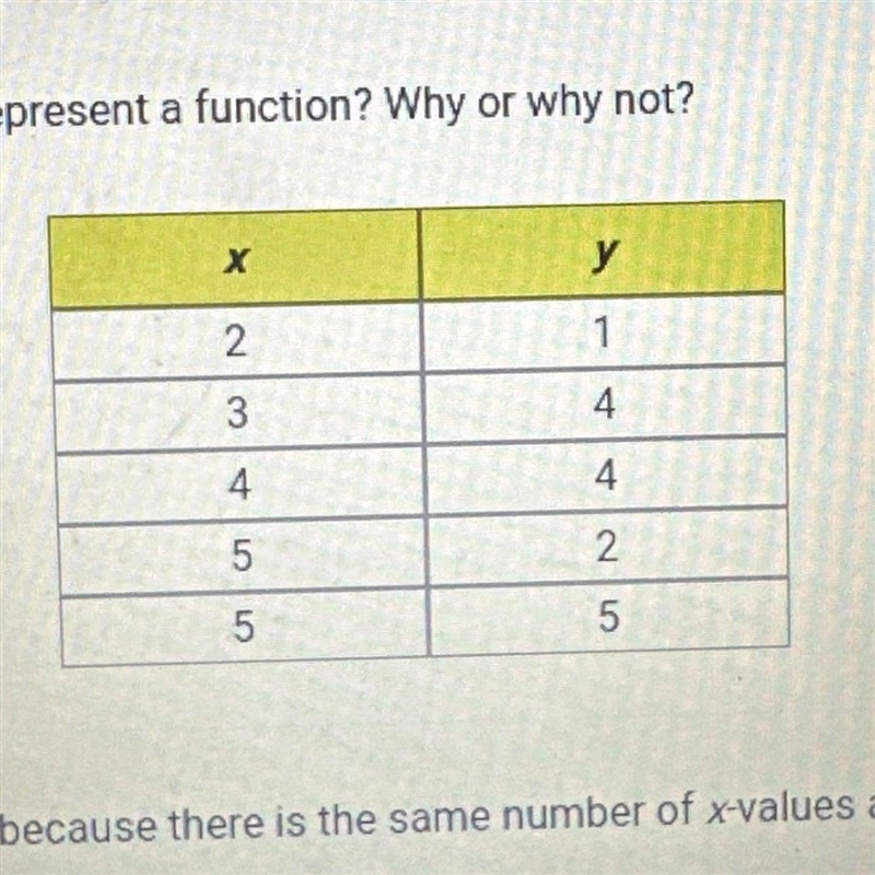 The table represents a function because each x-value corresponds to one and only one y-value, which satisfies the definition of a function.