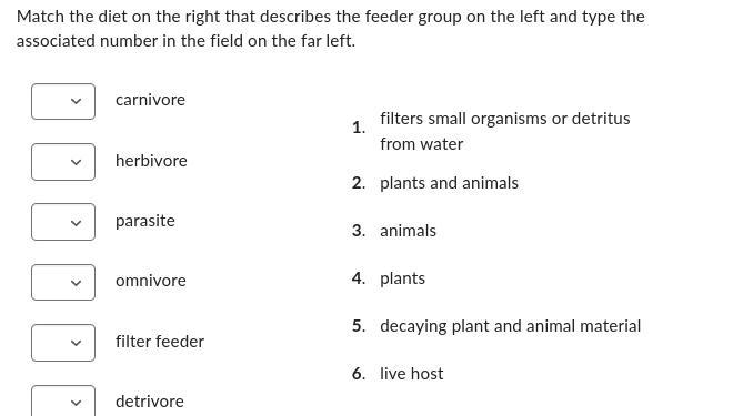 Feeder groups are categories of organisms based on their primary source of food. The most common feeder groups are: carnivores, herbivores, omnivores, insectivores, frugivores, granivores, nectarivores, planktivores, and detritivores. Carnivores feed primarily on animal tissue, herbivores feed primarily on plants, and omnivores feed on both animal and plant tissue. Insectivores feed primarily on insects, frugivores feed primarily on fruits, granivores feed primarily on grains, nectarivores feed primarily on nectar, and planktivores filter small organisms from water. Detritivores feed primarily on decaying plant or animal material. Some organisms, such as parasites, feed on a live host organism. It is important to understand these feeder groups and their associated diets in order to better understand the ecological roles and relationships of different organisms in their ecosystems.