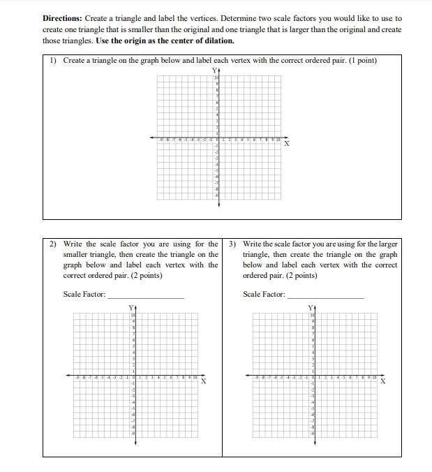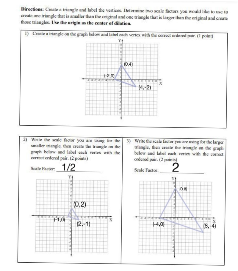 i suggest starting with a triangle with even numbered vertices so that for 2) you can use a scale factor of 1/2 and easily dilate.