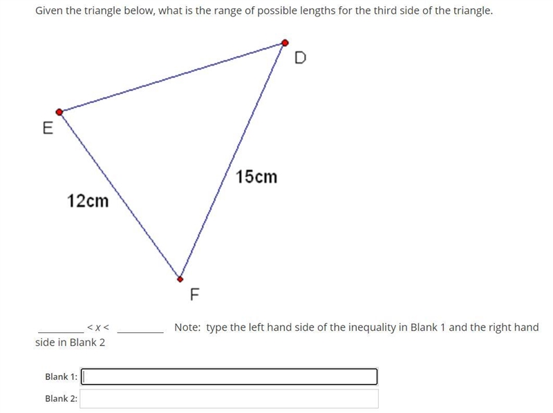 Given two sides are 12 cm and 15 cm in length, and the third side is "x", we can create three inequalities: