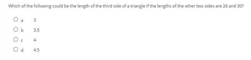 Given two sides lengths are 26 and 30, and the third side is "x", we can create three inequalities: