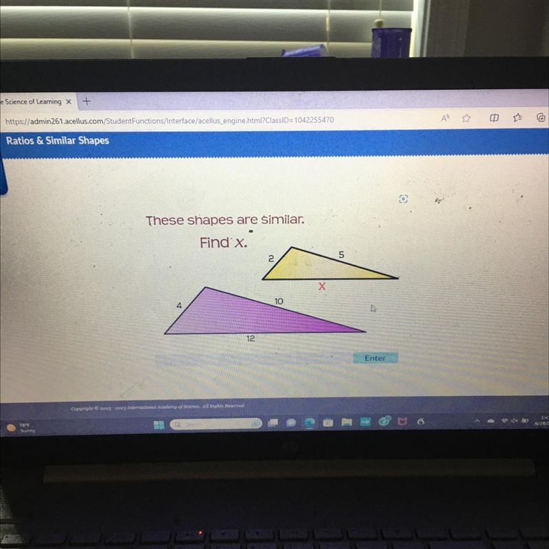 since the triangles are similar then the ratios of corresponding sides are in proportion, that is