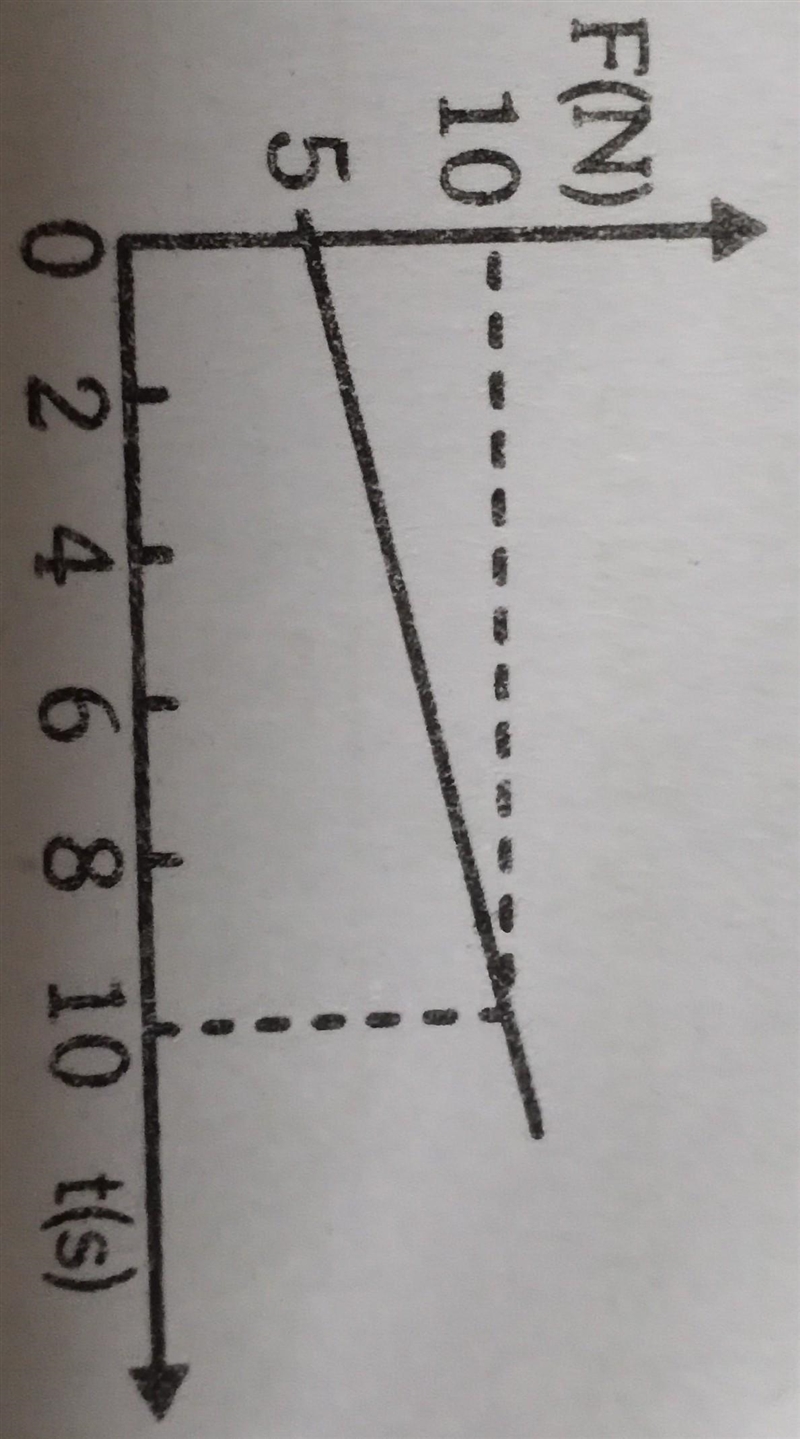 A varying force of F Newtons acts on a body of mass 10 kg. The relation between F & t is shown by the graph in fig. What is the change in speed of the object between t=0 s & t= 10 s?