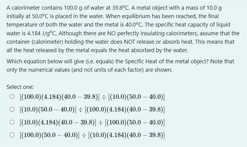 [(100(4.184)(40.0-39.8)] / [(10.0)(50.0-40.0)] = c, which is identical to the first option.