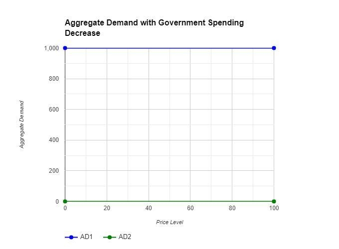The new aggregate demand curve (AD2) will be parallel to the initial aggregate demand curve (AD1) because the change in government spending is assumed to not affect prices (no "crowding out").