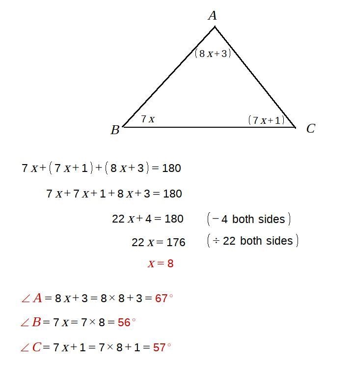 m∠A = 8x + 3 = 67 degrees m∠B = 7x = 56 degrees m∠C = 7x + 1 = 57 degrees