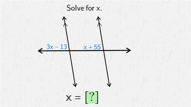 These 2 angles are corresponding angles, meaning that they are equal to each other. So, just set the 2 expressions equal to each other and solve for x.