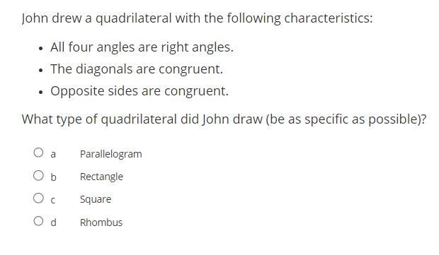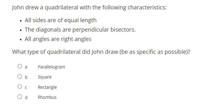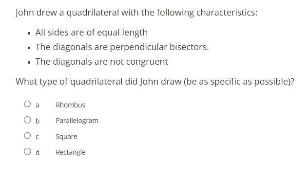 The diagonals in a square are congruent. Therefore, as the diagonals in John's quadrilateral are not congruent, John drew is a Rhombus.