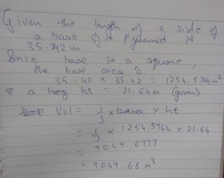 .The square pyramid at the entrance to the Louvre in Paris is 20.6 m. high and 35 meters on a side of the base. At night you can see two sides reflected in the pool around the pyramid. What is the surface area of the two sides and their reflection in the pool? What is the volume of the pyramid without the reflection?