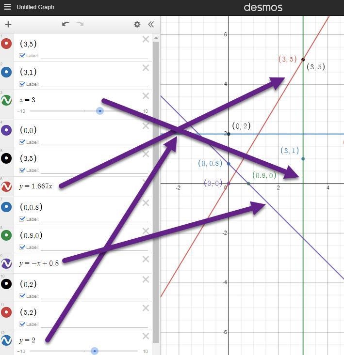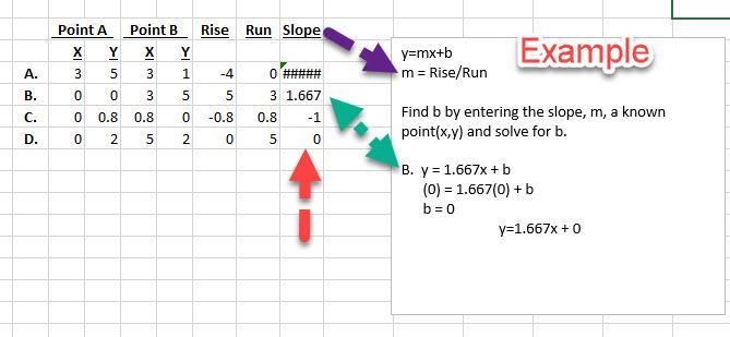 Set up a spreadshhet to calculate the rise and run for each line. The rise is the change in y and the run is the change in x between two pints. See FindEquations. All the points are set up so that the Rise and Run can be calculated for each set of points (A,D,C, and D). Slope is Rise/Run and is noted in the column with the red arrow. The first line has an infinite slope (#######).