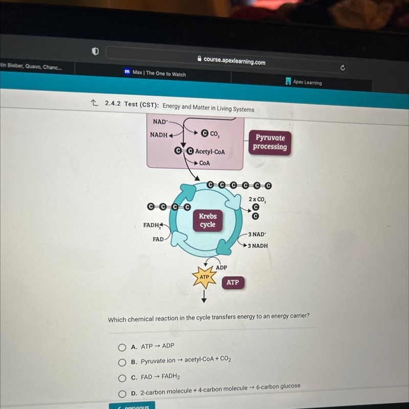 I can try to help you with your question. the **Krebs cycle** transfers energy from the molecules produced by glycolysis to electron carriers, such as **NADH** and **FADH2**, which will be used in the electron transport chain to produce ATP. Therefore, the chemical reactions that transfer energy to these electron carriers are the ones that involve **NAD+** and **FAD** as reactants. Based on the diagram, these reactions are steps 3, 4, 6, and 8 of the Krebs cycle. I hope this helps you.