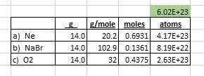 Atoms is 14.0 g of neon, Ne (20.18 g/mol) Formula units in 14.0 g of sodium bromide, NaBr